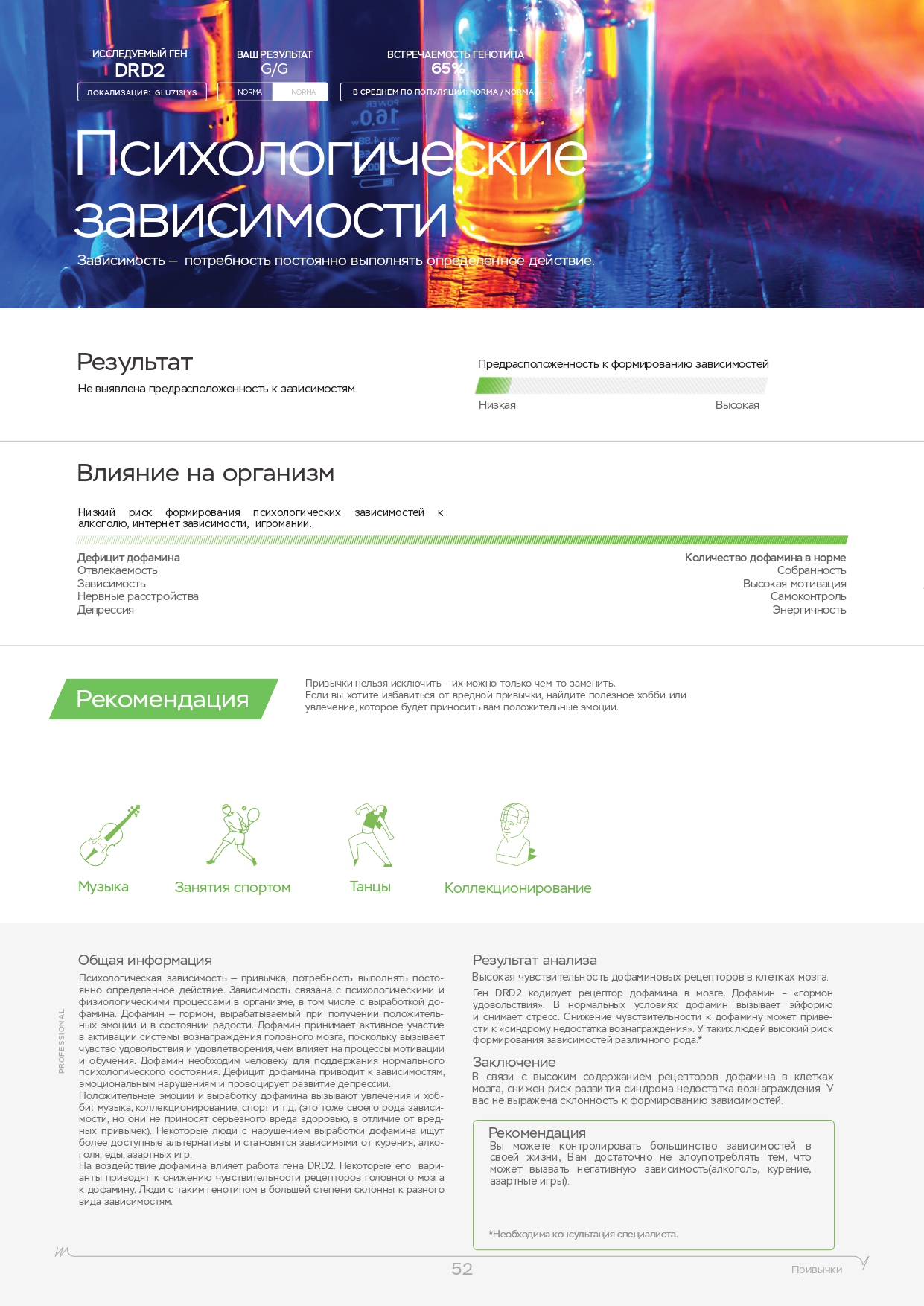 Этот ДНК анализ показывает влияние наиболее важных 10 генов на психическое и эмоциональное состояние. Именно они регулируют выработку гормонов, работу нейромедиаторов. Используйте знания о природных свойствах своего организма для борьбы со стрессом, повышения работоспособности и общего тонуса. Каждый человек индивидуален, поэтому мы рекомендуем пройти наш генетический нейро тест в Красноармейске.